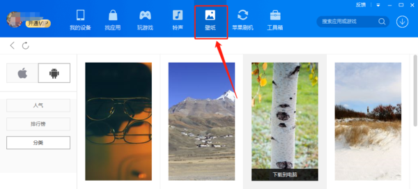 想要在91手机助手上,将壁纸下载到电脑上的小伙伴,在打开91手机助手客户端上,点击页面上方的“壁纸”图标。