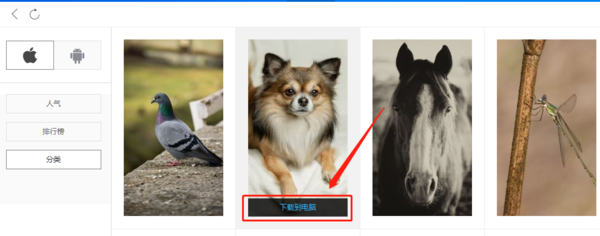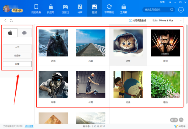 跳转到91手机助手壁纸页面后,在左侧选择对应的手机系统,并按照排行榜或者是壁纸图片分类,来查找想要下载的壁纸图片。