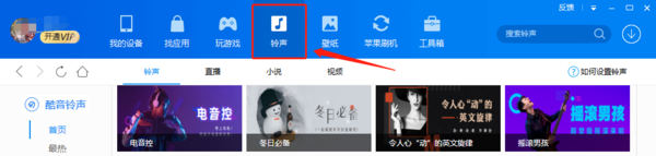 步骤一:在电脑上打开91手机助手客户端之后,点击页面上方的铃声图标。