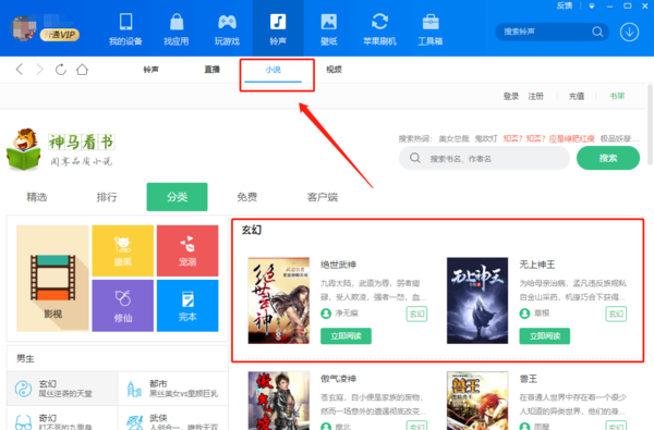 在91手机助手电脑版上,除了能下载铃声之外,还能阅读小说。同样是在铃声页面中,点击页面上方的小说字样,就能跳转到小说书架中,查找阅读小说了。
