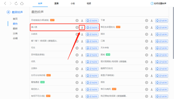 步骤三:找到想要下载的铃声后,可以点击播放键试听铃声,也可以直接点击“下载”键将铃声下载到手机上。