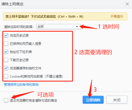 此外,我们还可以选择在退出浏览器后即清理,这样就不用我们时不常地打开清理界面了!