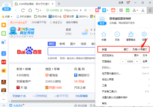 我们同样需要打开扩展功能栏,在其中可以看到一项为【新建】,在该项中我们可以选择新建普通窗口和无痕窗口,这时我们选择无痕窗口,就可以进行无痕浏览了。