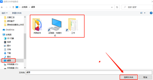 之后在弹出的路径选择页面中,选择其他位置文件夹,比如说桌面文件夹。选择好其他文件夹后,再点击“选择文件夹”键就可以了。