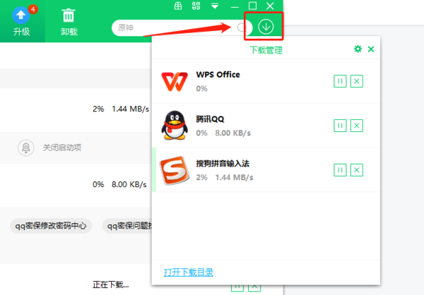 到这一步我们就完成了对电脑中软件的一键升级了,如果想要查看升级的进度,可以点击右上角的一个向下箭头样式的“下载管理”按钮,在这里就可以看到各个软件更新的进度了。