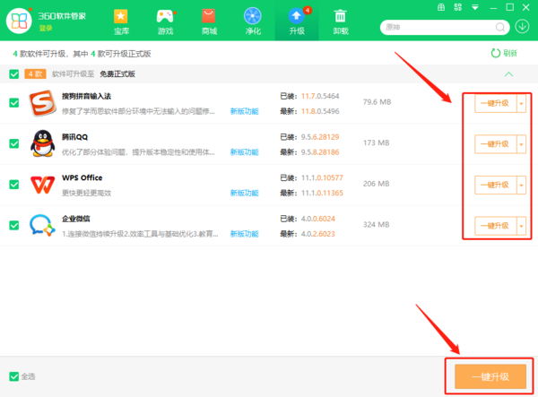 接着,我们进入到了软件升级界面,在这里我们可以看到有哪些需要升级更新的软件,软件默认的是全部待升级软件全选状态,可以直接点击下面的“一键升级”来进行版本更新。也可以选择部分需要升级的软件,对不需要升级的软件取消勾选,或是点击后面的“一键升级”。