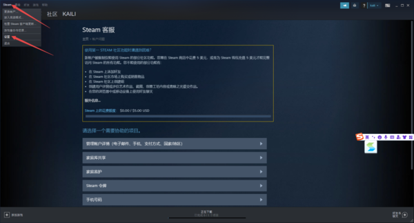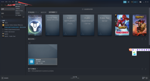 2、账号登录成功后,我们就会进入到steam平台的主界面当中了,此时我们找到界面顶部的【帮助】选项并点击它,然后在弹出的选项中选择【steam客服】选项。