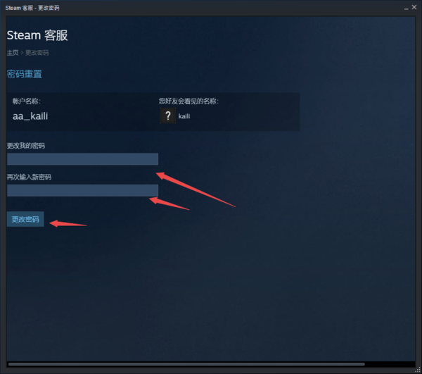 5、最后我们在更改密码的界面中,输入2次想要修改的密码,最后点击【更改密码】按钮即可成功的修改steam账户的密码了。