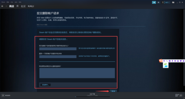 7、然后在页面中填写相关的验证信息,信息填写完以后,点击【发送】按钮,最后我们只需要等待steam的回复确认就可以进行账户的注销了。