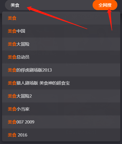 如果这些频道里,我们并没有找到适合自己的“下饭视频”。我们可以直接在搜索栏中输入“美食”并点击“全网搜”。