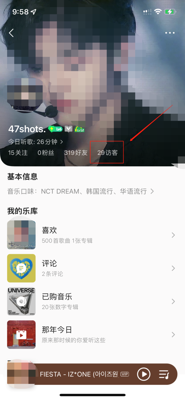 这时候页面就跳转到了个人听歌详情页面,我们可以在上方看到自己的头像和昵称以及今日听歌时长,在这些内容的下方有一个“访客”数量,我们直接点击就可以进入到访客记录列表了。