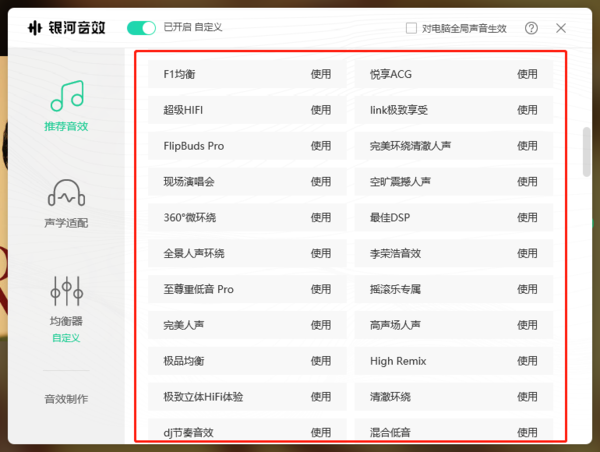 开启上方的“银河音效”,就可以在推荐音效中选择一款自己喜欢的音效了,也可以在下方的达人音效列表中挑选一款适用于自己听歌习惯的音效来使用。