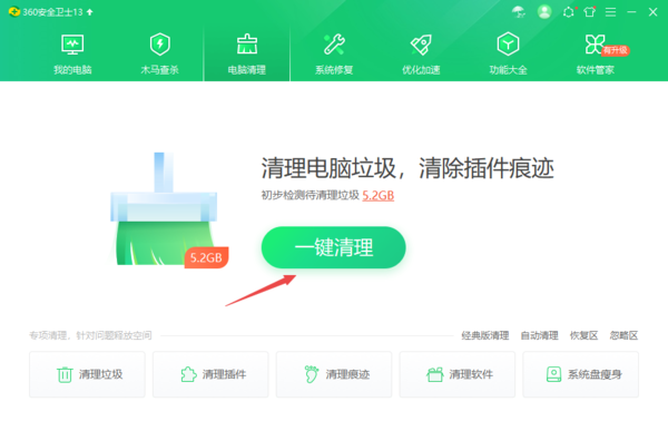 2、360软件管家不能下载其他软件,还有可能是你之前安装过这款软件,虽然软件卸载了,但是并没有卸载干净导致的。此时,我们用360安全卫士中的【电脑清理】功能,然后点击【一键清理】按钮。