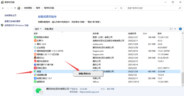 3、进入到电脑的控制面板界面,然后选择【卸载程序】选项,接着找到微信并按下鼠标右键,然后点击选择弹出来的【卸载/更改】选项,最后将微信进行卸载。电脑版微信卸载成功后,去微信官网界面,下载最新版本的微信软件,然后再进行安装,一般就可以解决电脑版微信打不开的问题。