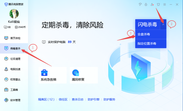 4、打开电脑上的腾讯电脑管家软件,然后点击选项【病毒查杀】选项,界面将【闪电杀毒】选择为【全盘杀毒】,来看看电脑上是否有病毒,若是发现病毒及时进行处理即可。
