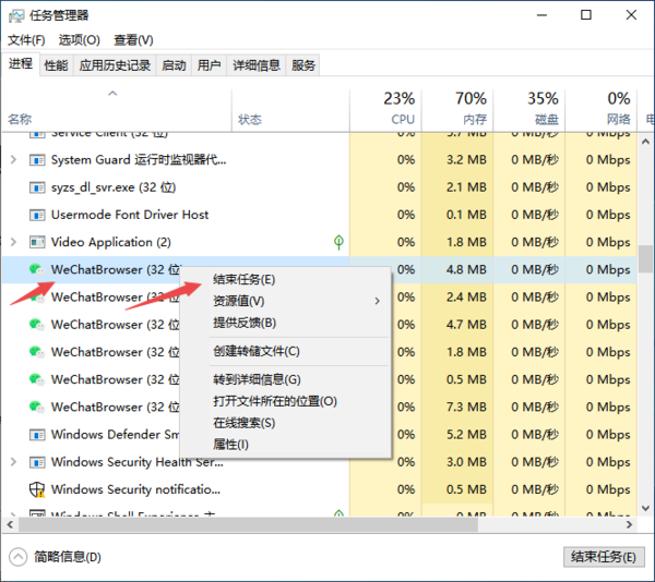 1、在电脑的任意界面上按下键盘上的【Ctrl+Alt+Delete】快捷键,接着在弹出的电脑的任务管理器窗口中,我们找到【微信】进程,然后按下右键,在弹出的选项中选择【结束任务】,最后再重新启动电脑版微信看看问题是否得到解决。