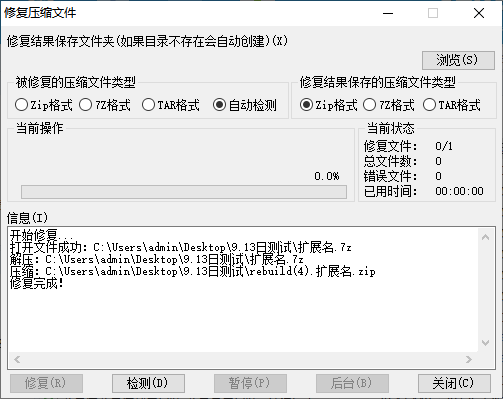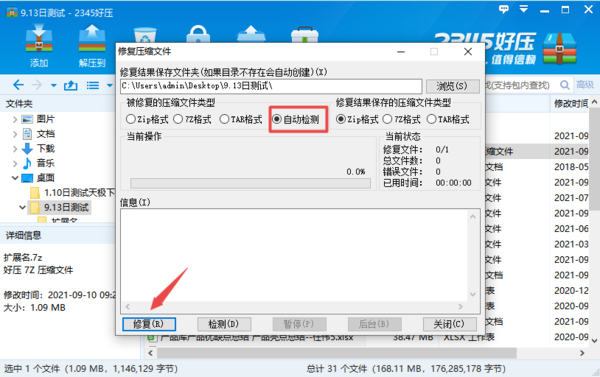 3.接着软件就会弹出修复压缩文件的窗口了,此时我们在【被修复的压缩文件类型】处,点击选择【自动检测】,最后在点击窗口左下角的【修复】按钮。