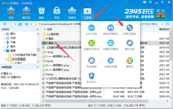 2.7z压缩包文件选中好以后,点击界面顶部的【工具箱】功能,然后在弹出的选项中点击选择【修复压缩包】功能。