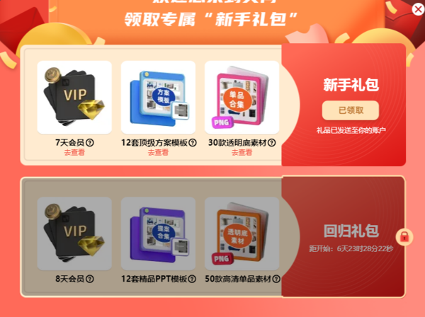 当我们进入美间新手礼包界面的时候,就可以看到新手礼包了,在新手礼包里,我们可以看到这3样奖励:分别是7天VIP,12套顶级方案模板,30款透明底素材。