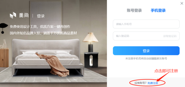 这里我们先说注册,当我们进入美间的注册登录界面,可以在登录框的下方看到“免费注册”字样,我们点击它即可进行注册。