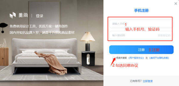 在弹出的注册界面里,我们只需在对应的框输入手机号和收到的验证码,并勾选同意下方的《用户服务协议》等文件,最后点击注册即可完成账号注册。由此可见,pc美间的注册对于大多用户来说,还是容易且人性的。