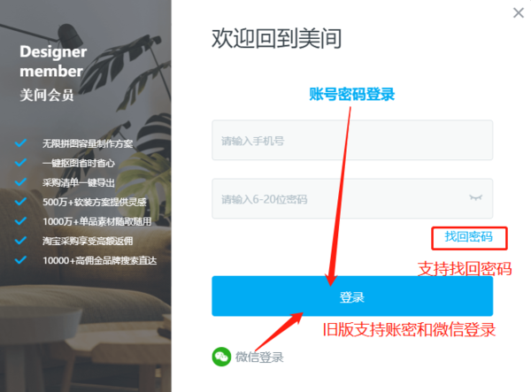 接下来是功能区别,首先是登录方式,旧版美间登录框支持账密登录和微信登录;而新版则支持账密登录和手机号验证码登录。这里的话,如果习惯账密登录,则新旧无所谓;如果习惯微信登录,则选用旧版登录框;习惯手机号验证码登录,则选用新版登录框。