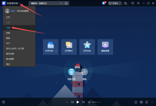 1、打开PC版恒星播放器,然后点击主界面左上角的【下拉】选项,接着在弹出的选项中选项【设置】选项。