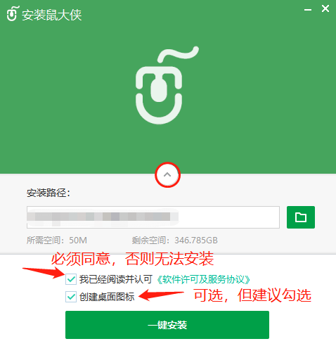 说到这鼠大侠鼠标连点器的安装,其实非常简单。当我们下载完鼠大侠的安装包后,打开它,映入眼帘的就是它的安装选项界面,在这里我们可以更改安装路径,以免直接将鼠大侠鼠标连点器直接安装在系统盘中,从而拖慢系统运行速度;此外,我们还可以选择是否在桌面设置快捷方式,对于这一点,小编建议大家勾选,这样的话,我们以后再使用它,直接在桌面上就能打开,不用费死劲地去磁盘中找了;还有一点值得一提,就是同意条款前的框,一定要处于勾选状态,否则我们将无法进行后续的安装。