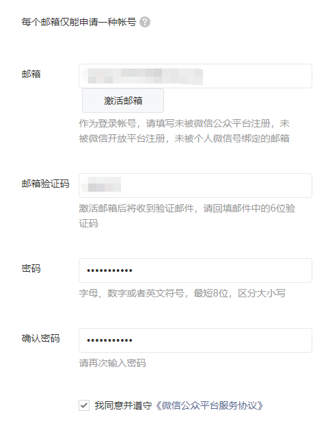 接下来需要我们填写公众号账号信息,例如邮箱、手机号、密码等。