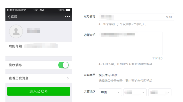 最后,待上述的重要部分都完成了,就是下面对我们的公众号进行个性化设定,如设置昵称、简介、类别、运营地区等内容。