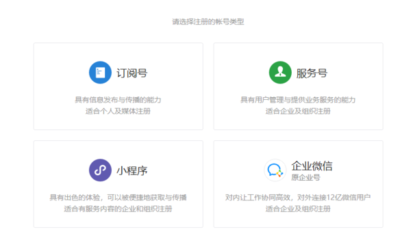 如果我们没有账号,在扫描二维码后会发现无法登录,此时就弹出注册账号入口,我们点击后,就会切换到选择账号类型的界面;其中包括订阅号、服务号、小程序以及企业微信,我们根据自己需要选择合适类型即可。