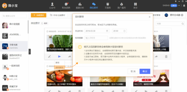 将鼠标放在素材下方的【群发】按钮上,出现【群发】和【定时群发】两个选择,点击【定时群发】即可设置,如果我们的账号是认证号,那么此时就可以设置到30天定时群发了,这让我们的内容分发不再是麻烦的。