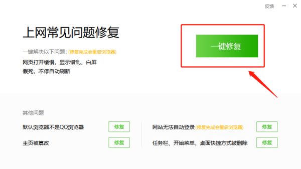 2、如果出现了浏览器崩溃的情况,也可以使用自带的“上网修复工具”来修复qq浏览器,点击浏览器右上角的“菜单”——“帮助”——“浏览器修复”,修复完成后,需要重启浏览器,然后就可以正常使用了。