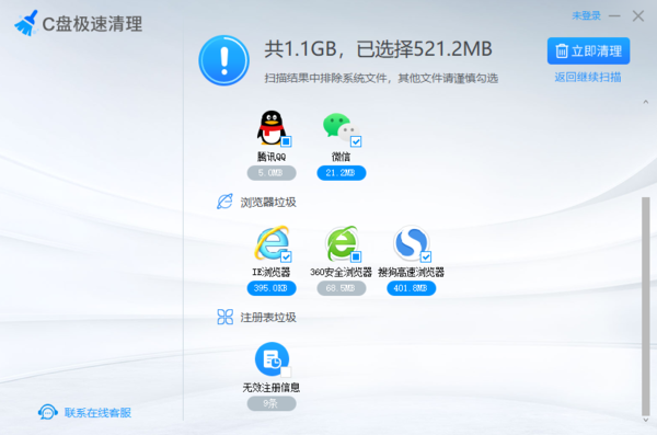 可以非常肯定的告诉大家,C盘极速清理软件即便是不进行登录,也是可以正常扫描电脑系统中所产生的垃圾的,但是如果想要清理扫描出来的C盘垃圾的话,我们就需要进行登录了。
