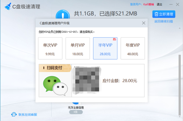 而C盘极速清理软件的VIP会员一共有四个价位可供大家选择,第一个价位是单次VIP会员9.99元,第二个价位是单月VIP会员18元,第三个价位是半年VIP会员28元,第四个价位是年度VIP会员48元,大家可以根据实际需求来进行VIP会员价位的选择。