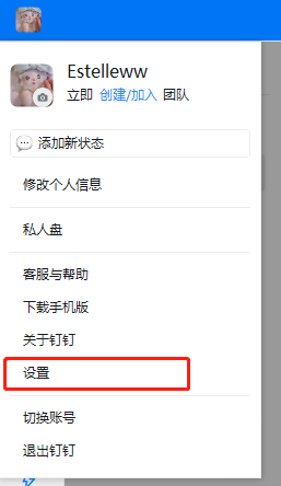 想要修改钉钉的密码时,先点击左上角“头像”,在出现的菜单中选择“设置”。