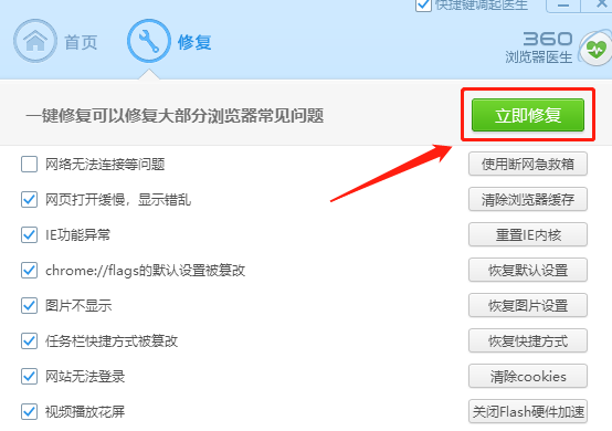 在浏览器医生的修复界面勾选出所遇到的问题,然后点击右上角的“立即修复”,就可以将浏览器的问题修复好了。
