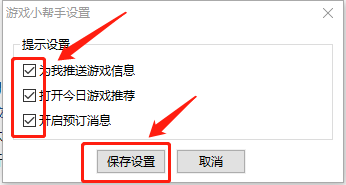 在“游戏小帮手设置”界面,取消勾选这三个选项,最后点击“保存设置”,之后再使用浏览器时就不会出现网页游戏弹窗频繁跳出的问题了。