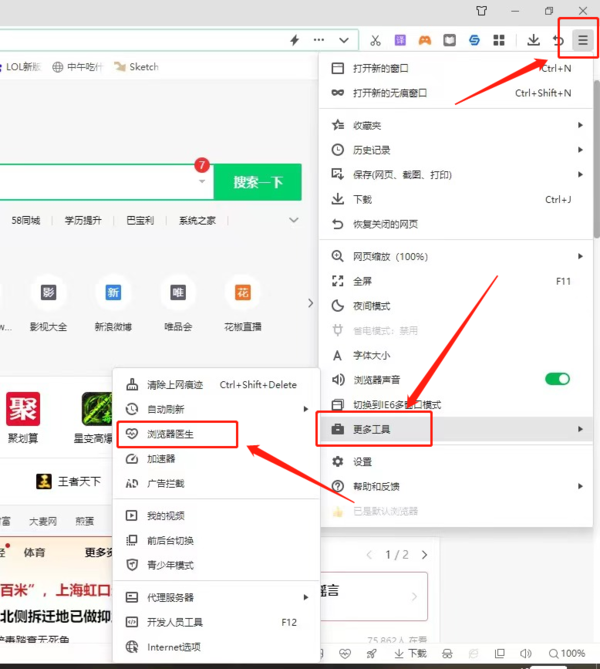 解决360浏览器闪退的问题可以借助浏览器本身内置的修复工具,点击右上角的“显示浏览器工具及常用设置选项”,接着在出现的菜单底部位置点击“更多工具”,然后再左侧的选险种单击“浏览器医生”。