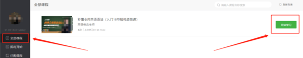 我们使用微信扫描二维码登录后,在左侧菜单栏中找到“全部课程”,点击进入后,客户端的右侧就会出现购买过的所有课程,选择一科准备开始学习的课程,单击后面的“开始学习”,就可以开始上课了。