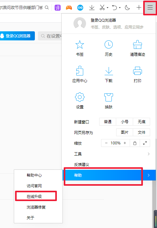 1、首先我们可以把电脑中的qq浏览器升级到最新版本,享受更稳定和快速的浏览体验。点击右上方“菜单”——“帮助”——“在线升级”,就可以升级浏览器了。或是卸载现有版本重新下载安装最新版。