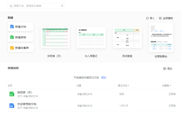企业微信中的在线文档功能是一个很好用的功能。在线文档功能模块中,我们可以根据自己的需求选择模板,然后进入文档编辑状态,编辑好内容之后,文档就自动保存在云端,我们随时都可以打开并修改。我们不需要再自己构思表格结构,现成的模板可以减少我们的很多麻烦,在线文档中的模板都是日常工作中经常用到表格类型,我们可以直接进行在线修改。
