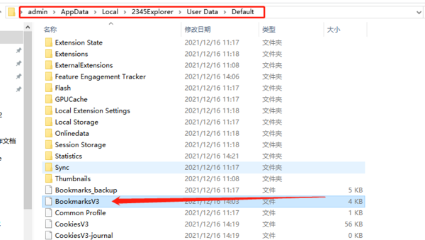 找到2345浏览器的文件存储位置后,在“UserData”文件夹中点击“default”,修改下方名称为“Bookmarks.bak”的收藏夹数据文本文档,将后缀.bak去掉,之后重启浏览器即可。