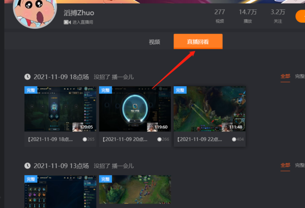 在页面中间位置单击“直播回看”,下面出现的视频就都是主播直播的回放视频了。