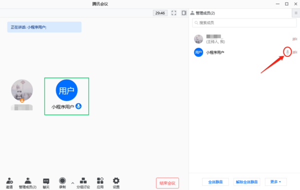 除了限制会议成员刚入会的时候是否禁言以外,我们还可以在会议的过程中设置成员是否出于禁言。