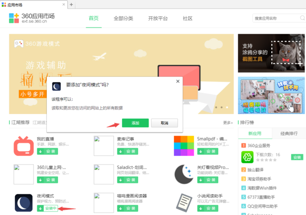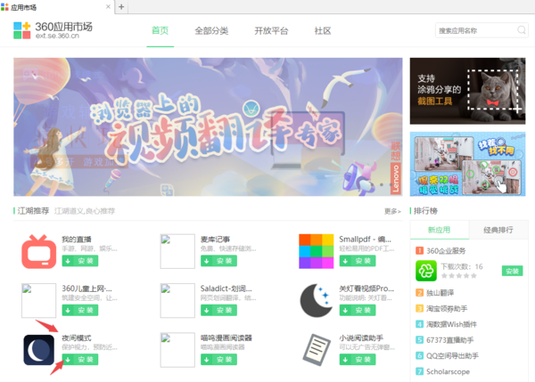 2、接着浏览器就会进入到360浏览器的应用市场界面当中了,此时我们便可以看到浏览器可以安装的扩展插件工具。找到想要安装的插件工具,比如【夜间模式】插件,然后点击【安装】按钮。