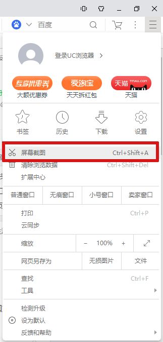 我们在打开uc浏览器后,主页面的右上角有一个菜单键(三条横线图标),点开菜单,下面的一个有剪刀图样的“屏幕截图”选项,这就是我们要找的截图功能了。在这个选项中我们可以看到,截图的快捷方式为“Ctrl+Shift+A”。如过我们直接点击“屏幕截图”,也是可以截图保存的。