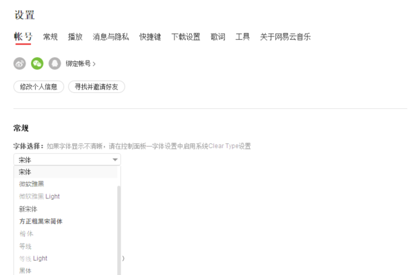 打开网易云音乐,在任意界面,其右上方有一个齿轮,点击后对网易云音乐进行设置。在设置界面的常规一栏,我们就可以看到字体的设置了,我们点击倒三角后,会弹出许多字体让我们选择,我们在选择字体后,歌词的字体也就随之切换。同样地,我们网易云音乐的其他地方的字体也会改变。