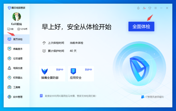 打开电脑上的腾讯电脑管家软件,接着进入到软件的主界面当中后,我们可以先在默认的【首页体验】界面的右侧,点击【全面体验】按钮,来电脑电脑进行一个全面的检测。