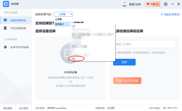2、打开快投屏,点击刷新可以快速找到可以投屏的设备,选择电视设备名进行投屏就好了,或者是将电视上的投屏码输入到电脑上也可以快速投屏。这里需要提一下,使用快投屏进行pc与电视的投屏,需要这两个设备连接至同一无线网下。